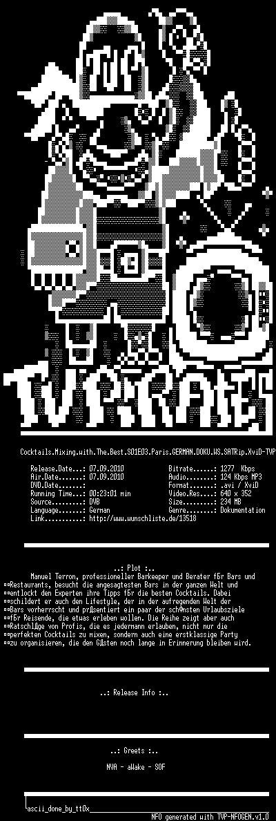 | FiLENAME: | Cocktails.Mixing.with.The.Best.S01E03.Paris.GERMAN.DOKU.WS.SATRip.XviD-TVP.avi |