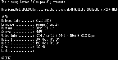 | FiLENAME: | American.Dad.S03E18.Der.glorreiche.Steven.GERMAN.DL.FS.1080p.HDTV.x264-TMSF.mkv |