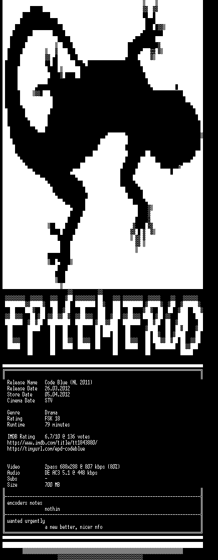 | FiLENAME: | Code.Blue.2011.German.AC3.BDRip.XviD-EPHEMERiD.avi |