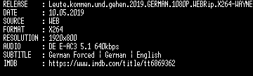 | FiLENAME: | Leute.kommen.und.gehen.2019.GERMAN.1080P.WEBRip.X264-WAYNE.mkv |