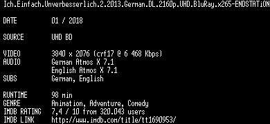 | FiLENAME: | Ich.Einfach.Unverbesserlich.2.2013.German.DL.2160p.UHD.BluRay.x265-ENDSTATiON.mkv |