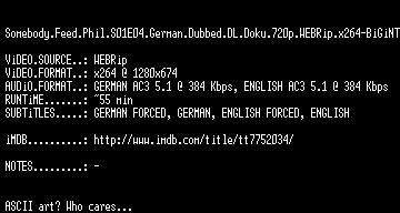| FiLENAME: | Somebody.Feed.Phil.S01E04.German.Dubbed.DL.Doku.720p.WEBRip.x264-BiGiNT.mkv |
