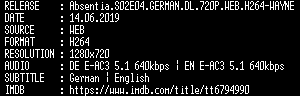 | FiLENAME: | Absentia.S02E04.GERMAN.DL.720P.WEB.H264-WAYNE.mkv |
