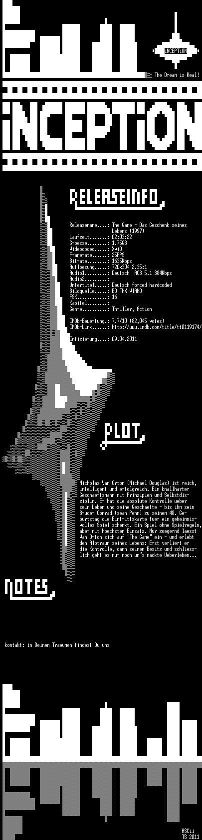 | FiLENAME: | The.Game.Das.Geschenk.seines.Lebens.1997.German.AC3.BDRip.XviD-iNCEPTiON.avi |