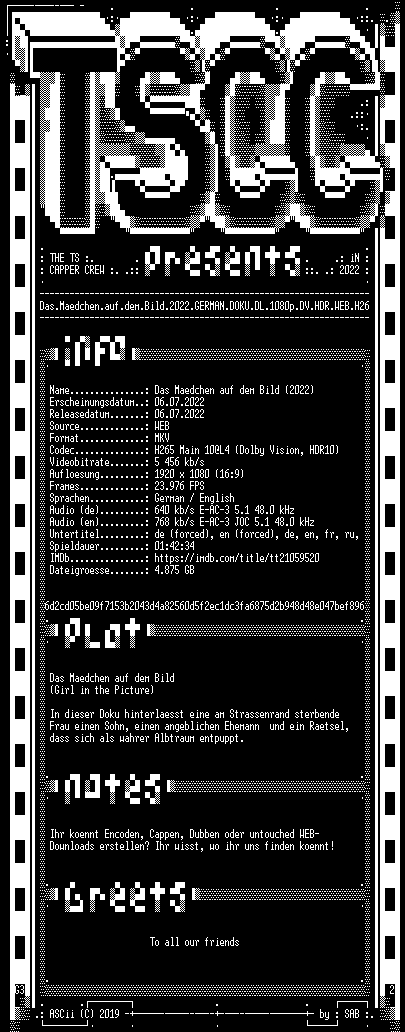 | FiLENAME: | Das.Maedchen.auf.dem.Bild.2022.GERMAN.DOKU.DL.1080p.DV.HDR.WEB.H265-TSCC.mkv |