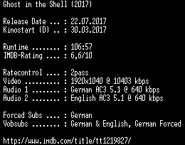 | FiLENAME: | Ghost.in.the.Shell.2017.German.DL.1080p.BluRay.x264-COiNCiDENCE.mkv |
