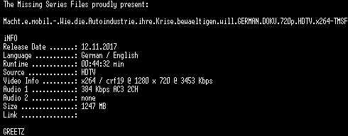 | FiLENAME: | Macht.e.mobil.-.Wie.die.Autoindustrie.ihre.Krise.bewaeltigen.will.GERMAN.DOKU.720p.HDTV.x264-TMSF.mkv |