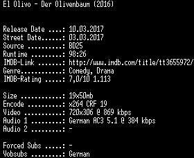 | FiLENAME: | El.Olivo.Der.Olivenbaum.German.2016.AC3.BDRip.x264-SPiCY.mkv |