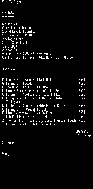 | FiLENAME: | Soundtrack - Twilight (2008) [MP3-VBR-V2].rar |