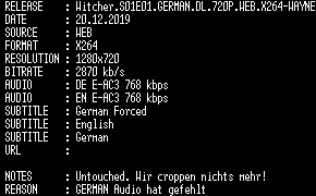 | FiLENAME: | Witcher.S01E01.GERMAN.DL.720P.WEB.X264-WAYNE.mkv |