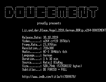 | FiLENAME: | Liz.und.der.Blaue.Vogel.2018.German.BDRip.x264-DOUCEMENT.mkv |