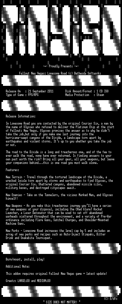 | FiLENAME: | Fallout.New.Vegas.Lonesome.Road.DLC-TiNYiSO.bin |