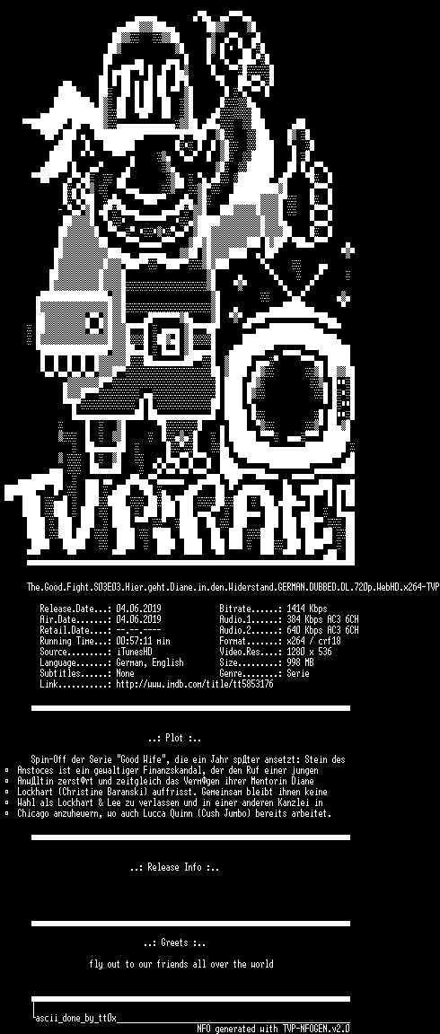 | FiLENAME: | The.Good.Fight.S03E03.Hier.geht.Diane.in.den.Widerstand.GERMAN.DUBBED.DL.720p.WebHD.x264.PROPER-TVP.mkv |