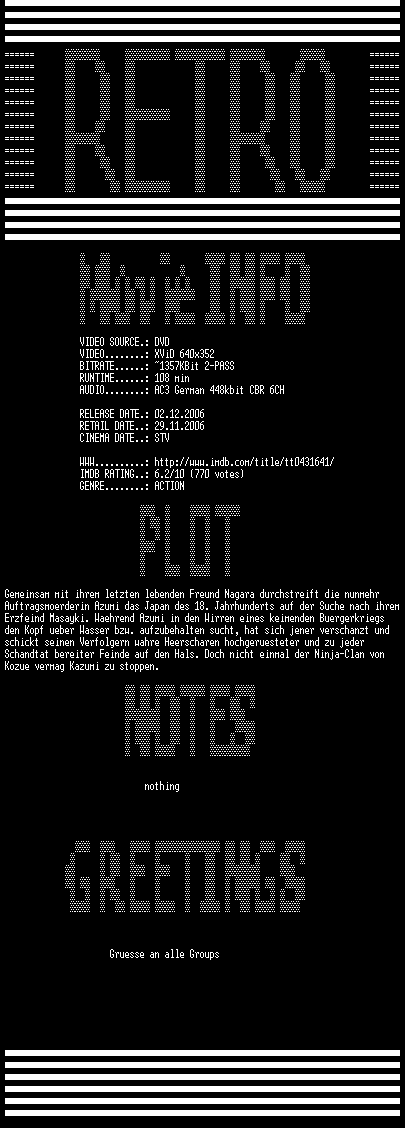 | FiLENAME: | Azumi 2 - Death or Love (2005) [GER-AC3 WS DVD] CD1.avi |