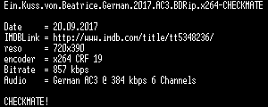 | FiLENAME: | Ein.Kuss.von.Beatrice.German.2017.AC3.BDRip.x264-CHECKMATE.mkv |