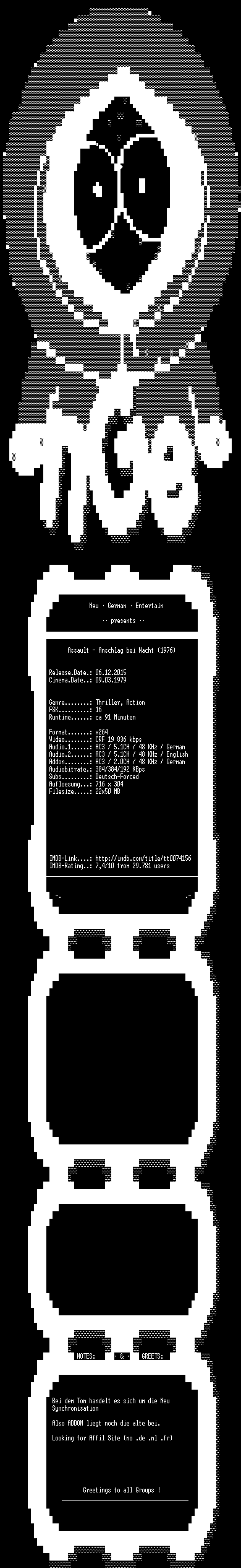 | FiLENAME: | Assault.Anschlag.Bei.Nacht.German.1976.DL.DVDRiP.x264.iNTERNAL-NGE.mkv |