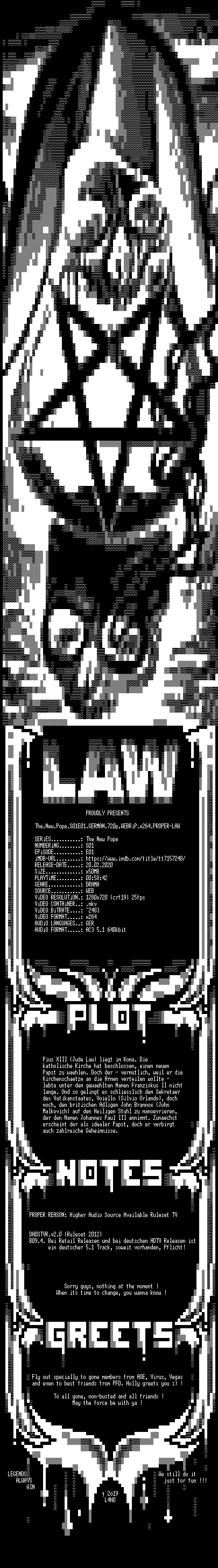 | FiLENAME: | The.New.Pope.S01E01.GERMAN.720p.WEBRiP.x264.PROPER-LAW.mkv |