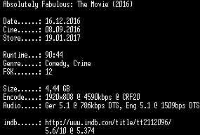 | FiLENAME: | Absolutely.Fabulous.Der.Film.2016.German.DL.DTS.1080p.BluRay.x264-CiNEViSiON.mkv |