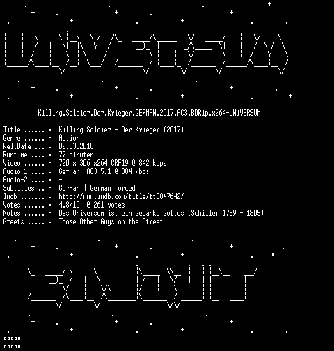 | FiLENAME: | Killing.Soldier.Der.Krieger.GERMAN.2017.AC3.BDRip.x264-UNiVERSUM.mkv |