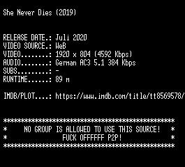 | FiLENAME: | She.Never.Died.2019.German.1080p.WEB.h264-SLG.mkv |