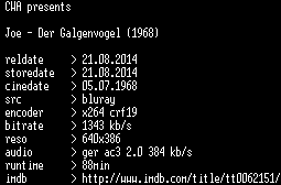 | FiLENAME: | Joe.Der.Galgenvogel.1968.German.BDRip.x264.iNTERNAL-CWA.mkv |