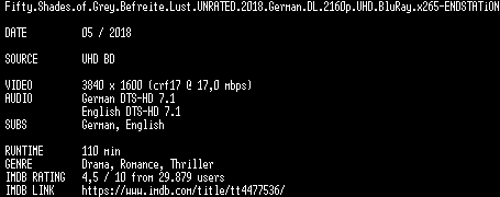 | FiLENAME: | Fifty.Shades.of.Grey.Befreite.Lust.UNRATED.2018.German.DL.2160p.UHD.BluRay.x265-ENDSTATiON.mkv |
