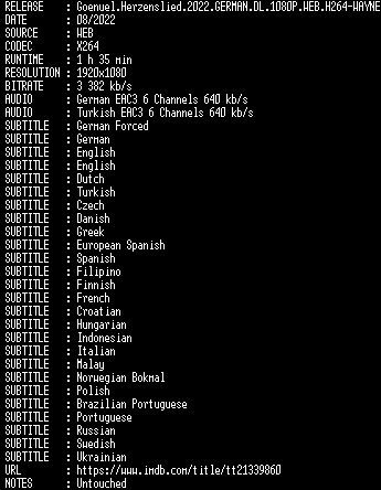 | FiLENAME: | Goenuel.Herzenslied.2022.GERMAN.DL.1080P.WEB.H264-WAYNE.mkv |