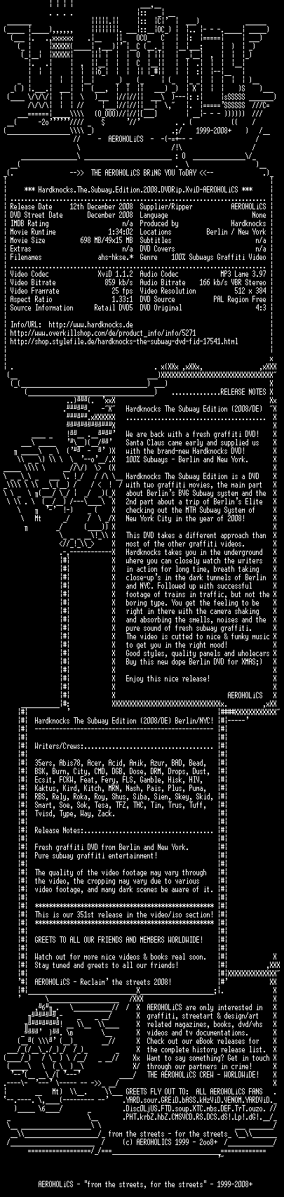| FiLENAME: | Hardknocks.The.Subway.Edition.2008.DVDRip.XviD-AEROHOLiCS.avi |