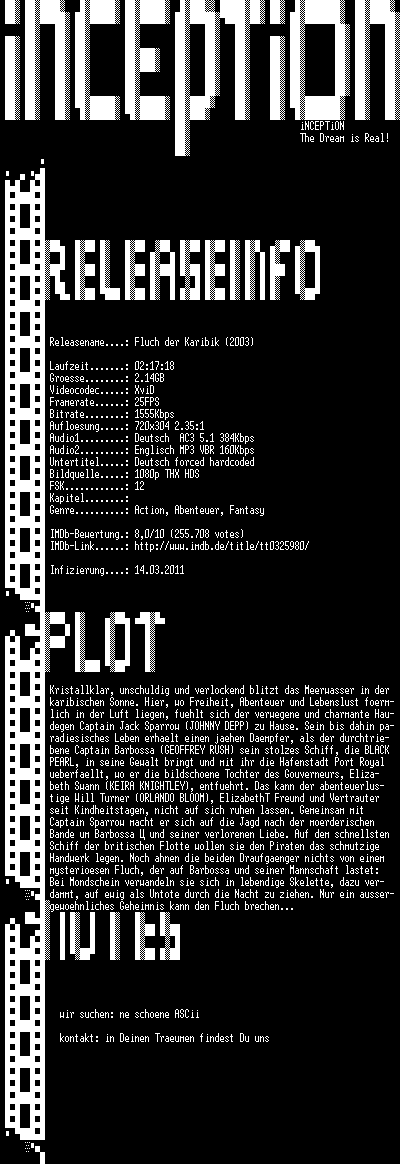 | FiLENAME: | Fluch.der.Karibik.1.2003.German.AC3.DL.BDRip.XviD-iNCEPTiON.avi |