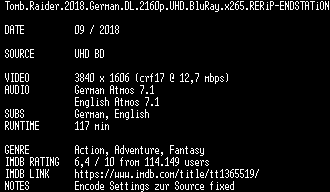 | FiLENAME: | Tomb.Raider.2018.German.DL.2160p.UHD.BluRay.x265.RERiP-ENDSTATiON.mkv |