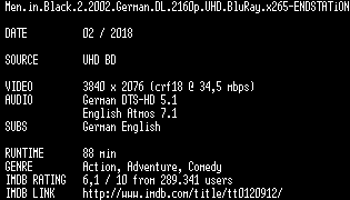 | FiLENAME: | Men.in.Black.2.2002.German.DL.2160p.UHD.BluRay.x265-ENDSTATiON.mkv |