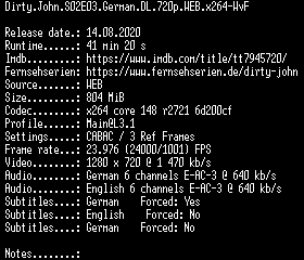 | FiLENAME: | Dirty.John.S02E03.German.DL.720p.WEB.x264-WvF.mkv |