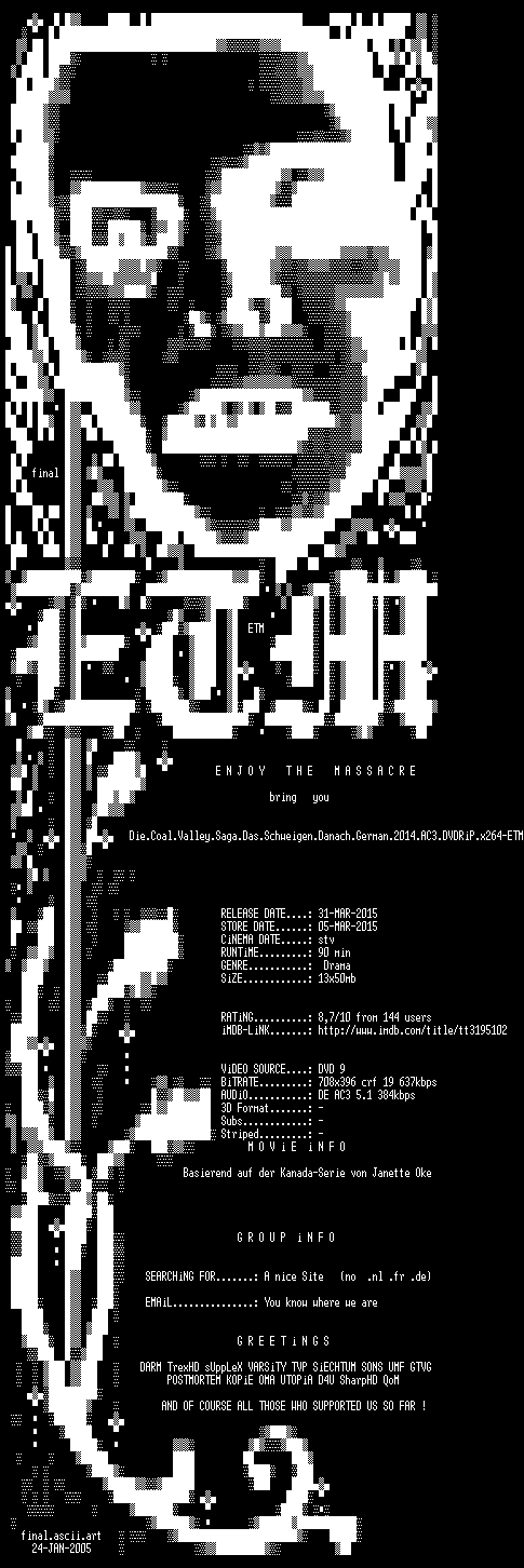 | FiLENAME: | Die.Coal.Valley.Saga.Das.Schweigen.Danach.German.2014.AC3.DVDRiP.x264-ETM.mkv |