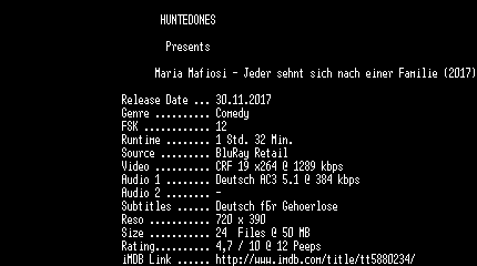 | FiLENAME: | Maria.Mafiosi.Jeder.sehnt.sich.nach.einer.Familie.German.2017.AC3.BDRip.x264-HUNTEDONES.mkv |