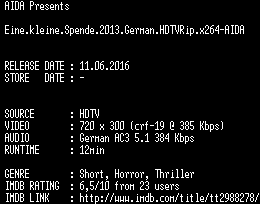 | FiLENAME: | Eine.kleine.Spende.2013.German.HDTVRip.x264-AIDA.mkv |
