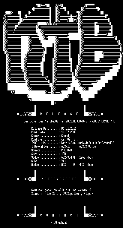 | FiLENAME: | Der.Schuh.des.Manitu.German.2001.AC3.DVDRiP.XviD.iNTERNAL-NTB.avi |