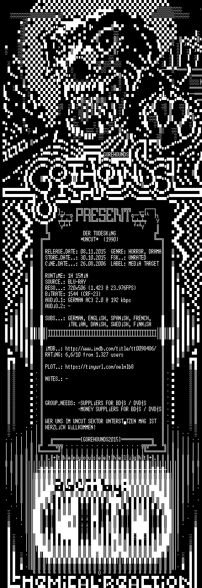| FiLENAME: | Der.Todesking.UNCUT.GERMAN.1990.BDRiP.x264-GOREHOUNDS.mkv |