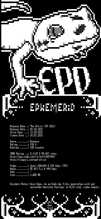| FiLENAME: | The.Artist.German.AC3.BDRip.XviD.READ.NFO-EPHEMERiD.avi |
