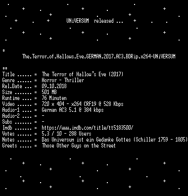 | FiLENAME: | The.Terror.of.Hallows.Eve.GERMAN.2017.AC3.BDRip.x264-UNiVERSUM.mkv |
