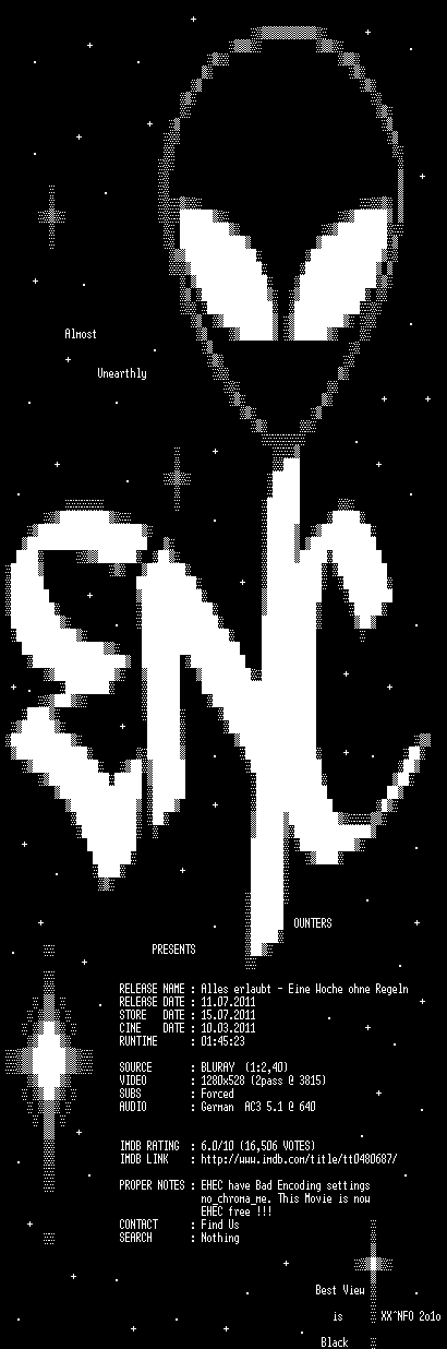 | FiLENAME: | Alles.erlaubt.Eine.Woche.ohne.Regeln.2011.German.720p.BluRay.x264.PROPER-ENCOUNTERS.mkv |