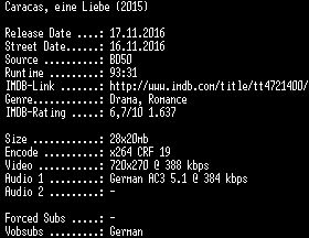 | FiLENAME: | Caracas.Eine.Liebe.German.2015.AC3.BDRip.x264-SPiCY.mkv |