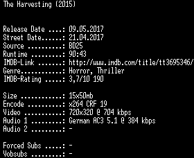 | FiLENAME: | The.Harvesting.Die.Sonnenwende.naht.German.2015.AC3.BDRip.x264-SPiCY.mkv |