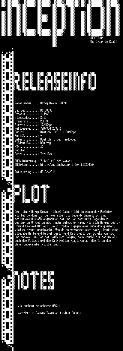 | FiLENAME: | Harry.Brown.2009.German.AC3.BDRip.XviD-iNCEPTiON.avi |