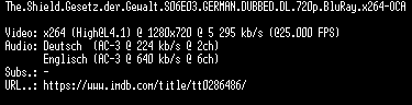 | FiLENAME: | The.Shield.Gesetz.der.Gewalt.S06E03.GERMAN.DUBBED.DL.720p.BluRay.x264-OCA.mkv |