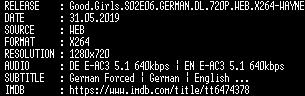 | FiLENAME: | Good.Girls.S02E06.GERMAN.DL.720P.WEB.X264-WAYNE.mkv |