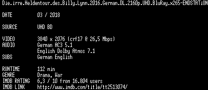 | FiLENAME: | Die.irre.Heldentour.des.Billy.Lynn.2016.German.DL.2160p.UHD.BluRay.x265-ENDSTATiON.mkv |