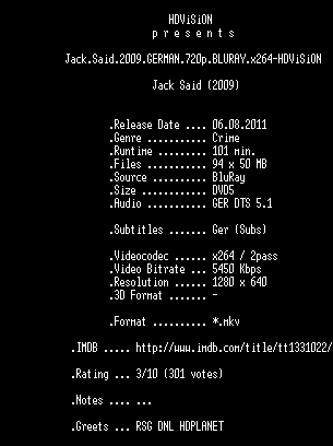 | FiLENAME: | Jack.Said.2009.GERMAN.720p.BLURAY.x264-HDViSiON.mkv |