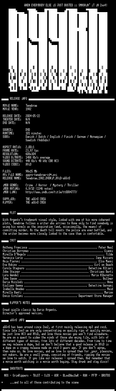 | FiLENAME: | Tenebrae.1982.DVDRiP.XViD-aGGr0.CD1.avi |