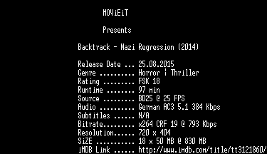 | FiLENAME: | Backtrack.German.2014.AC3.BDRip.x264-MOViEiT.mkv |
