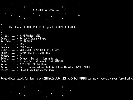 | FiLENAME: | Hard.Powder.GERMAN.2019.AC3.BDRip.x264.REPACK-UNiVERSUM.mkv |